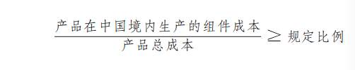 产品在中国境内生产的组件成本占比应当达到规定比例,计算公式为: